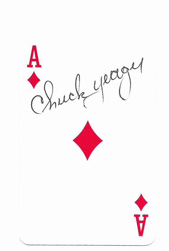 (1923-2020). Record scoring test pilot. First pilot to exceed the speed of sound. First pilot in his group to be “Ace in a Day.’ At war’s end he is credited with 11.5 victories. Ace of Diamonds playing card. Signed in full.  Yeager was not fond of signing these type cards . In fine condition................