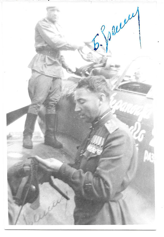 YEREMIN, Boris. Fighter pilot, U.S.S.R. Ace credited with 24 victories. Photograph, B&W, 3.5”X5”, of the pilot in uniform wearing his medals. He is standing in front of his plane. Boldly signed on the clear portion of the shy. In fine condition.................SOLD![]() |
