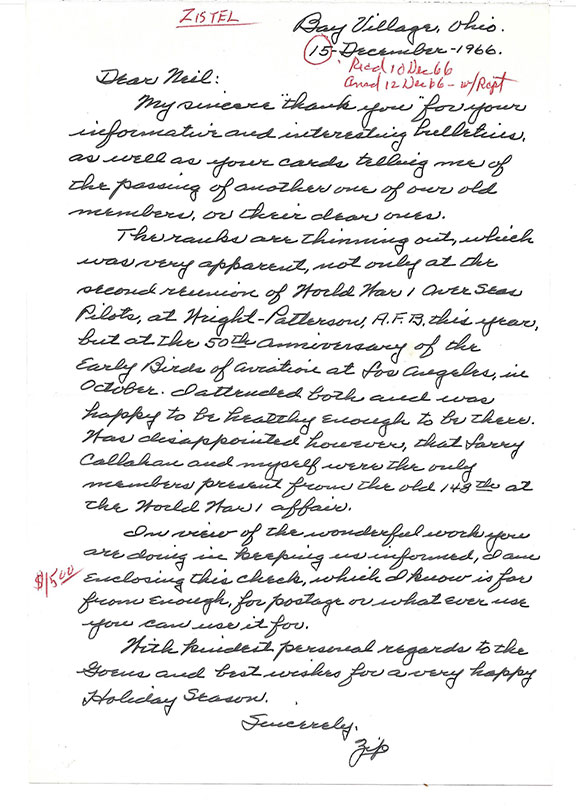ZISTELL, Eroll H. (?- 1968). American fighter pilot in WW1. Fought with the 42nd Squadron of the Royal Flying Corps and scored 3 victories. Transferred to the AEF’s 148th Pursuit Squadron and scored an additional 3 victories. Total of 6 during WW1. He also served in WWII and rose to the rank of Major General. Autograph letter signed, one very full page, 15 Dec. 1966. To Dear Neil. The Ace writes in part: “...as well as your cards telling me of the passing of another one of our old members... the ranks are thinning out which was very apparent, not only at the second reunion of WW1 over seas pilots...but at the 50th anniversary of the Early Birds of Aviation... was disappointed however that Larry Callahan and myself were the only members present from the old 148th at the WW1 affair...” Signed “Zip”. A few notations by the recipient otherwise a very fine example.....$87.50