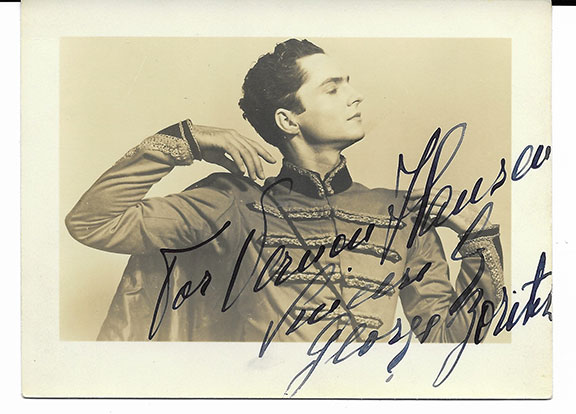 ZORITCH, George (1917-2009). Russian born, American opera and ballet dancer. He danced all over the United States from the 1930’s to the 60’s. He was one of the most glamorous figures and striking personalities in mid-twentieth century ballet. He also has several film credits. Photograph, 4”x5”, B&W, half length in a dance pose. Inscribed and signed: “For Vernon Hanson, Sincerely, George Zoritch.” In very fine condition.......................$57.50![]() |
