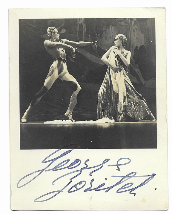 ZORITCH, George (1917-2009). Russian born, American opera and ballet dancer. He danced all over the United States from the 1930’s to the 60’s. He was one of the most glamorous figures and striking personalities in mid-twentieth century ballet. He also has several film credits. Photograph, 4”x5”, B&W, full length in a dance pose along with a female dancer. Very boldly signed on the lower white margin.......................$57.50![]() |