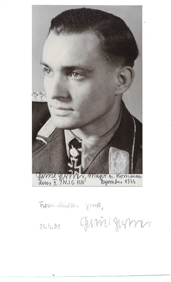 ZORNER, Major Paul (1920-2014). German fighter pilot during WWII. Flew with the NJG-5. Ace credited with 59 victories. Awarded the Knight’s Cross with Oak Leaves. Photograph, 3.5”x5”, B&W, Head and shoulders pose in uniform. Signed in full adding his rank, command and dated December 1944 all written on the lower white border. A very attractive and desirable photograph...................... $95.00 |