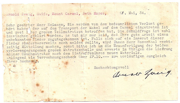 ZWEIG, Arnold (1887-1968). German novelist. His war novel “The Case of Sergeant Grischa” (1927) was an International success. His other works deal with Jewish topics. Exiled from Germany by the Nazi’s he lived in Palestine from 1933. In 1957 he was appointed President of the E. Berlin Academy of Arts. The USSR awarded him the Lenin Peace Prize (1958). Typed letter signed, one page, Haifa, May 25, 1934. In German, not translated. Two minor holes and light foxing otherwise a V/G example...............................$75.00